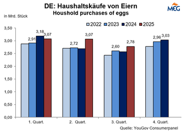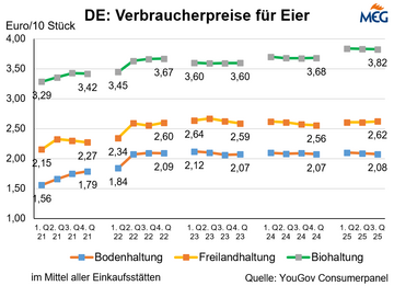 Deutschland Haushaltskäufe Preise (MMB) Der Lebensmitteleinzelhandel bezieht seine Eier innerhalb eines Jahres in der Regel zu festen Kontraktpreisen. Daher ziehen Marktschwankungen am Spotmarkt keine veränderten Verbraucherpreise nach sich. Auch 2025 gab es in den...