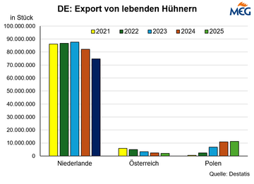 Außenhandel Deutschland (MMB) Viele in Deutschland gehaltene Hühner werden im Ausland geschlachtet, während die Importe eine kleinere Rolle spielen. Von Januar bis Juli 2025 standen laut Destatis einem Einfuhrvolumen von 109,5 Mio. Tieren Exporte von 23,5 Mio....