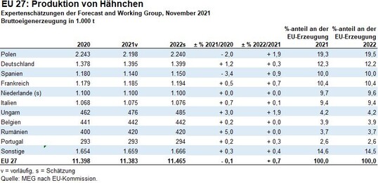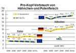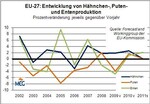 Im Jahr 2025 sollen sich die Hähnchenschlachtungen auf 11,47 Mio. t belaufen, das wären 83 % der Gesamterzeugung. Damit stieg der Anteil gegenüber 2023 nochmal um 2 Prozentpunkte an. Von 2023 auf 2024 stieg die Produktion um 2,8 % auf 10,86 Mio. t. Für 2025 erwartet die Kommission mit plus 5,6 % eine deutlichere Steigerung. Leichteres Wachstum am Putenmarkt Die EU-Putenschlachtungen dürften sich 2025 auf 1,68 Mio. t belaufen, das wäre ein Plus von 1,0 %. Bereits von 2023 auf 2024 zeichnete sich dieses Wachstum ab. Damit beliefe sich der Anteil der Putenschlachtungen 2025 auf 12 %, wobei man gegen über Vorjahr 1 Prozentpunkt einbüßte. Die Entenschlachtungen konnten sich 2024 nach vorherigen AI-Ausfällen deutlich erholen. Sie werden 2025...