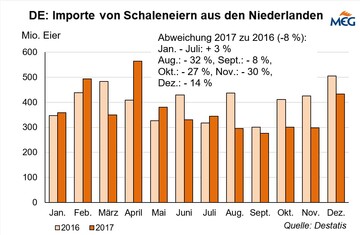 (MMB) Die deutsche Eierproduktion wurde in den ersten sieben Monaten des Jahres 2019 ausgeweitet. Allein in den an das Statistische Bundesamt meldepflichtigen Betrieben (3.000 Haltungsplätze und mehr) wurden mit 7,32 Mrd. Eiern 2,3 % mehr erzeugt als von Januar bis Juli 2018. Nicht berücksichtigt...
