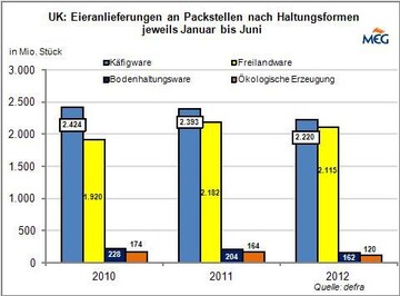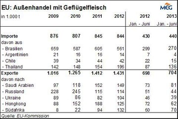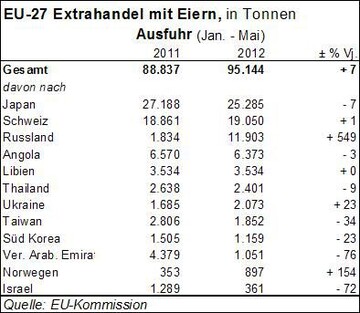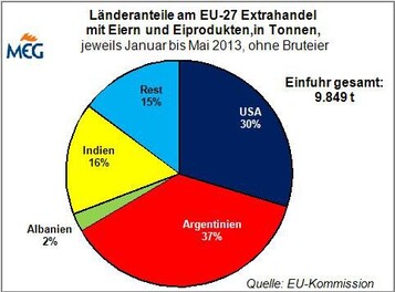 (MMB) Die erfasste deutsche Eierproduktion legte im ersten Halbjahr laut Destatis um 3,7 % auf 5,42 Mrd. Eier zu (siehe auch Eier kompakt 36/2013 Seite 4). Daher sank der deutsche Importbedarf an Eiern. Die Einfuhren von Schaleneiern zum Verzehr sanken nach den vorläufi-gen Angaben von Destatis...