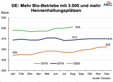 (MMB) Im Laufe des Jahres 2020 wurde die Erzeugung von Bioeiern in Deutschland ausgeweitet. Insbesondere im dritten Quartal kamen neue Betriebe hinzu.