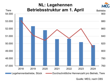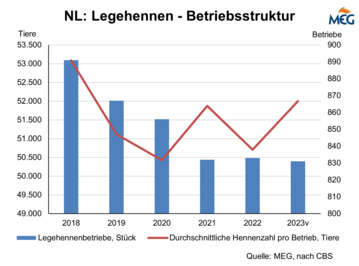 (AM) In den Niederlanden ist die Zahl der Legehennen in den vergangenen Jahren zurückgegangen. Waren es 2018 noch insgesamt 47,3 Mio. Tiere, fallen die Zahl bis 2022 kontinuierlich auf 42,2 Mio. Das ist ein Nachteil um 11 %. Im Jahr 2023 stieg die Zahl wieder leicht auf 43,1 Mio. Tiere, wie das...