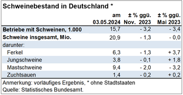 (Destatis) Zum Stichtag 3. Mai 2024 gab es in Deutschland 15 700 schweinehaltende Betriebe. Wie das Statistische Bundesamt (Destatis) nach vorläufigen Ergebnissen der Viehbestandserhebung mitteilt, nahm die Zahl der Betriebe damit im Vergleich zum 3. November 2023 um 3,2 % (-500 Betriebe) ab.