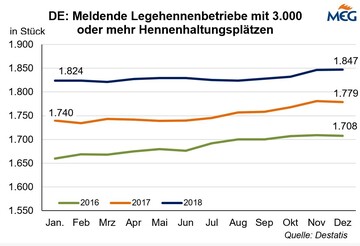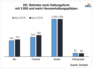 (MMB) Im April 2019 meldeten laut Destatis 1.896 Betriebe zur monatlichen Eierproduktions- und Hennenstatistik. Damit gab es in Deutschland 69 Betriebe mehr als im April 2018. Zur Statistik melden Betriebe mit 3.000 und mehr Haltungsplätzen. Kleinere Produktionseinheiten, wie z. B. mobile...