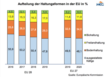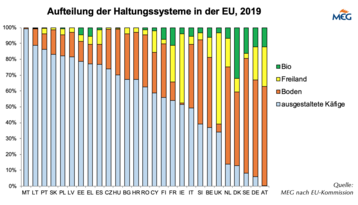 (MMB) In vielen Ländern der EU dominiert noch die Hennenhaltung in ausgestalteten Käfigen. In immer mehr großen Produktionsländern nahm die Bedeutung der Alternativhaltung von 2018 auf 2019 aber zu.