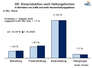 (MMB) Die Eierproduktion in Deutschland wurde im Jahr 2020 ausgeweitet. Dies belegen die vorläufigen Jahresergebnisse des Statistischen Bundesamtes zur Legehennenhaltung und Eierproduktion in Betrieben mit 3.000 oder mehr Haltungsplätzen.