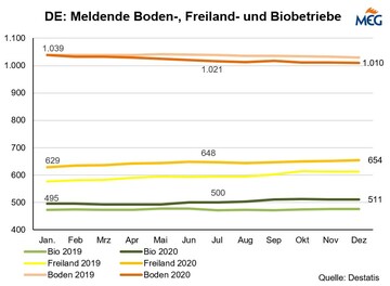 (MMB) Im Oktober 2020 meldeten 1.956 Legehennenbetriebe mit 3.000 oder mehr Haltungsplätzen zur monatlichen Produktionsstatistik von Destatis. Im Oktober 2019 waren es noch 43 Betriebe weniger. Im Laufe des Jahres 2020 gab es kaum Schwankungen der Betriebszahlen.