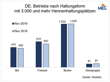 (AM) Im November 2019 meldeten laut Destatis 1.912 Betriebe zur monatlichen Eierproduktions- und Hennenstatistik. Das waren 66 Betriebe mehr als noch im November 2018. Die Statistik erfasst nur Betriebe mit 3.000 und mehr Haltungsplätzen, kleinere Produktionseinheiten, wie z. B. mobile...