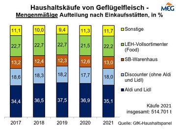 (MMB) Discounter sind die führenden Einkaufsstätten in Deutschland. Laut Situationsbericht des Deutschen Bauernverbandes wurden im Jahr 2020 rund 43,6 % des Lebensmittelumsatzes bei den Discountern generiert. Am Schlachtgeflügelmarkt war die Bedeutung der Discounter noch größer.