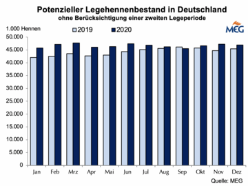 (MMB) Im Mittel der ersten drei Monate 2020 waren in Deutschland laut Destatis 43,2 Mio. Legehennen eingestallt, das waren 1,2 % mehr als im ersten Quartal 2019.
