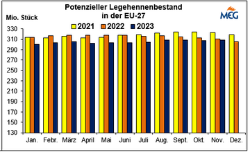 Insgesamt war der EU-Eiermarkt im Verlauf dieses Jahres keineswegs reichlich mit Eiern versorgt. So belegt es auch der von der MEG berechnete potenzielle Legehennenbestand für die EU-27.