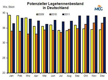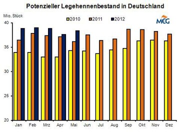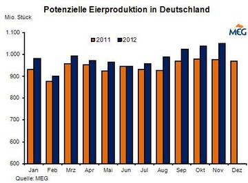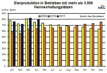 (MMB) Im Juni 2012 schlüpften in Deutschland laut Statistischem Bundesamt 3,51 Mio. Legeküken, das waren 7,6 % weniger als zwölf Monate zuvor. Kumuliert über das erste Halbjahr wurde das Vorjahresergebnis mit 24,90 Mio. Küken noch um 3,8 % übertroffen.