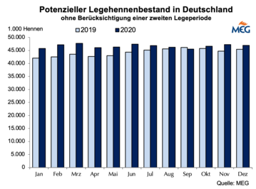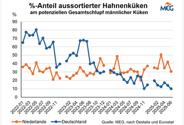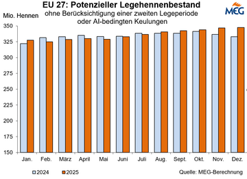 (MMB) Der Legehennenbestand in der EU könnte zum Jahresende hin wieder deutlicher das Vorjahresniveau überschreiten. MEG-Berechnungen zu den potenziellen Legehennenbeständen ergeben, dass im vierten Quartal 2025 EU-weit etwa 346 Mio. Hennen eingestallt sein werden, dass wären rund 9 Mio. Hennen...