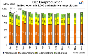 (MH) Laut Statistischem Bundesamt wurden in den ersten neun Monaten dieses Jahres 9,7 Mrd. in Betrieben mit 3.000 und mehr Hennenhaltungsplätzen. Eier erzeugt, damit wurde das 2022er Ergebnis um 2,2 % verfehlt. Ab der Jahreshälfte wurde die monatliche Produktion aber stetig übertroffen, so dass...