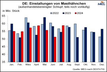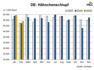 (MMB) Von Januar bis Juli 2024 schlüpften laut MEG-Berechnung in der EU 177,6 Mio. Legeküken zum Gebrauch. Damit wurde das entsprechende Vorjahresergebnis um 1,4 % verfehlt. Nicht aus allen EU-Ländern lagen anhand von nationalen Statistiken oder Eurostat verwertbare Informationen vor. Für die...