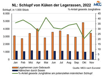 (MMB) Im Jahr 2023 kam es zu schwankenden Schlupfergebnissen. Kumuliert von Januar bis November schlüpften in deutschen Brütereien 16,56 Mio. weibliche Küken der Legeherkünfte, das waren 12 % mehr als in den ersten elf Monaten 2022. Der deutliche Einbruch der Schlupftätigkeit des Jahres 2022...