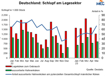(MMB) Nachdem in den ersten drei Monaten des Jahres 2023 in Deutschland laut Destatis 5,6 % mehr Legeküken zum Gebrauch schlüpften, wurde das Vorjahresergebnis im April 2023 wieder um 14,3 % unterschritten und im Mai um 5,8 %. So erreichte der Schlupf in den ersten fünf Monaten dieses Jahres...