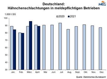 (MMB) In deutschen Brütereien schlüpften in den ersten vier Monaten 2021 laut Destatis 210,7 Mio. Masthähnchen, das waren 3,3 % weniger als im gleichen Zeitraum des Vorjahres.
