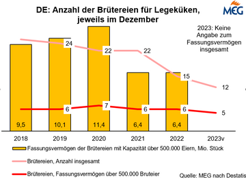 (MMB) Nur noch 12 Brütereien ermittelte das Statistische Bundesamt im Dezember 2023 für den Legehennensektor. Das warens nochmal 3 Betriebe weniger als Ende 2022. Davon schlüpfte in 11 Betrieben Legehennen zum Gebrauch und in nur noch einer Brüterei Legerassen zur Zucht und Vermehrung. Das...