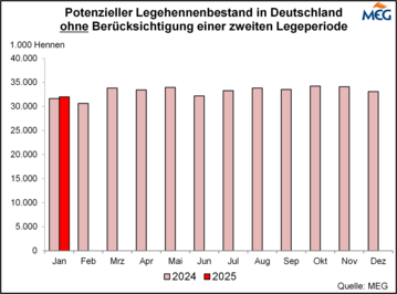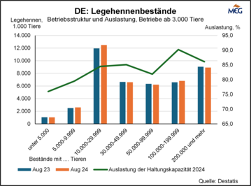 (MMB) Der Legehennenbestand in der EU könnte zum Jahresende hin wieder deutlicher das Vorjahresniveau überschreiten. MEG-Berechnungen zu den potenziellen Legehennenbeständen ergeben, dass im vierten Quartal 2025 EU-weit etwa 346 Mio. Hennen eingestallt sein werden, dass wären rund 9 Mio. Hennen...