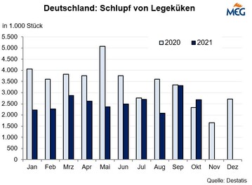 (MMB) Im Januar 2022 schlüpften deutlich weniger Legeküken in deutschen Brütereien als im gleichen Monat des Vorjahres (minus 26,3 %). Bereits im Jahr 2021 schlüpften am Legesektor weniger Küken zum Gebrauch. Im Gesamtjahr waren es 29,44 Mio. Küken, das waren 27 % weniger als 2020.