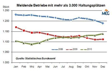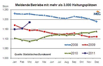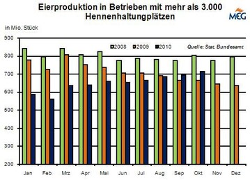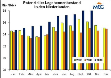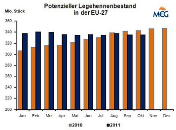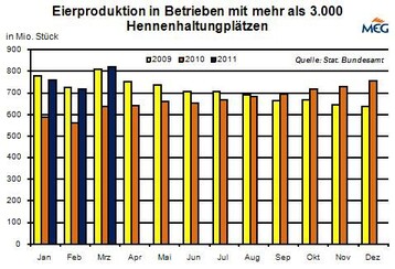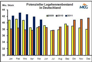 (MMB) Im September 2011 schlüpften laut DESTATIS 4,469 Mio. Legeküken, das waren 11,0 % mehr als im gleichen Monat 2010. Kumuliert von Januar bis September schlüpften 35,637 Mio. Küken, das war gegenüber 2010 ein Zuwachs von 3,5 %.