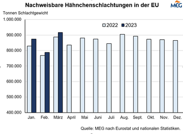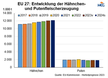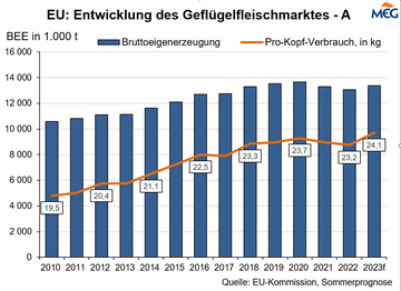 (MMB) Laut Bericht der Europäischen Kommission von Oktober 2023 steigt die EU-Konsumeierproduktion 2023 im Vergleich zu 2022 um 1,0 % auf 6,30 Mio. t. Für 2024 gehen die Experten davon aus, dass die EU-Produktion von Konsumeiern im Vergleich zu 2023 um 0,2 % steigen wird.