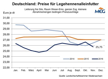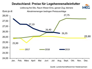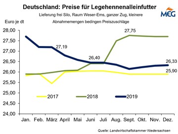 (MMB) In der zweiten Jahreshälfte 2019 konnten die Legehennenhalter zu recht stabilen Preisen Mischfutter beziehen. In der ersten Jahreshälfte hatten niedrigere Einstandspreise für eiweiß- und stärkehaltige Komponenten noch zu tendenziell nachgebenden Mischfutterpreisen geführt.