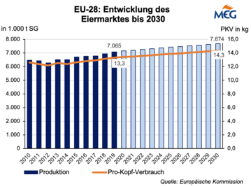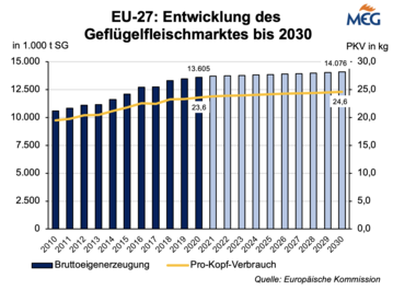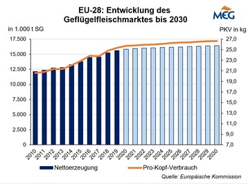 (MMB) Anfang der zweiten Kalenderwoche 2021 hat die Europäische Kommission die Prognose zur Entwicklung des EU-Marktes für Geflügelfleisch bis zum Jahr 2030 aktualisiert. Die Daten beziehen nun erstmals die Daten des Vereinigten Königreichs nicht mehr mit ein.