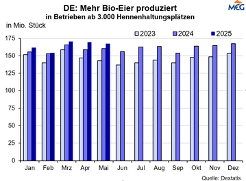 (MMB) Die Produktion von Bio-Eiern stieg in den ersten fünf Monaten dieses Jahres an. Laut Destatis wurden in den meldepflichtigen Bertrieben ab 3.000 Hennenhaltungsplätzen 823,4 Mio. Bio-Eier erzeugt, das waren 3,8 % mehr als in den ersten fünf Monaten 2024. In den vergangenen zehn Jahren wurde...