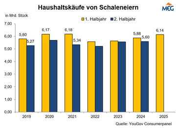 (MMB) Marktteilnehmer berichteten in den zurückliegenden Monaten überwiegend von einer lebhaften Verbrauchernachfrage nach Eiern. Dass die Kaufmenge spürbar über dem Vorjahreslevel lag, belegt nun auch die Auswertung des YouGovConsumerpanels. Im ersten Halbjahr 2025 beliefen sich die...