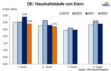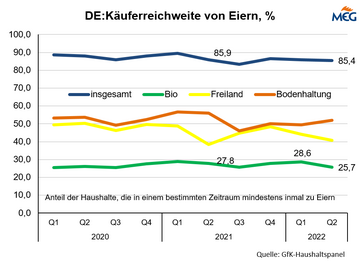 (MMB) Binnen eines Jahres kaufen fast alle Haushalte mindestens einmal Eier. Im Jahr 2021 betrug die Käuferreichweite (KRW) bei Eiern insgesamt 93,6 %. Bezogen auf einzelne Quartale liegt dieser Wert etwas niedriger, laut Haushaltspanel der GfK legten im zweiten Quartal dieses Jahres 85,4 % aller...