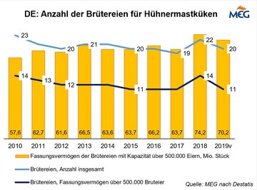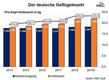 (MMB) Das Verbrauchswachstum der zurückliegenden Jahre wurde hauptsächlich am Hähnchenmarkt generiert. So entfiel im Jahr 2019 bereits 67 % des Geflügelfleischverbrauchs auf Hähnchen. Im Jahr 2014 waren es erst 60%. Die MEG kalkulierte für 2019 einen Pro-Kopf-Verbrauch von 15,6 kg, das waren 300 g...