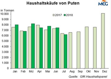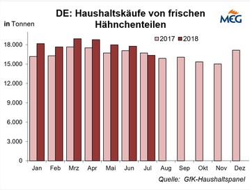 (MMB) Im Juli gehen die Haushaltskäufe von Geflügelfleisch aufgrund der Feriensaison erfahrungsgemäß zurück. In diesem Jahr wurde das Interesse der Verbraucher noch zusätzlich durch die Wettersituation gebremst. Der Deutsche Wetterdienst bezeichnete den Juli 2018 als extrem warm und sonnig. Es war...