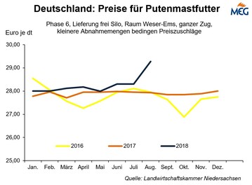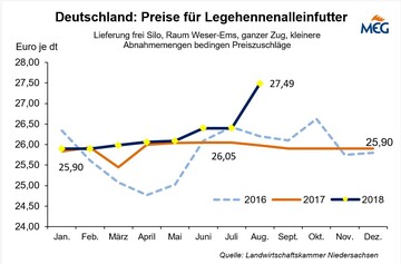 (MMB) Laut Landwirtschaftskammer Niedersachsen zogen die Preise für Legehennenfutter an, und zwar von 26,40 Euro je dt Mitte Juli auf 27,25 Euro je dt Anfang August (ohne MwSt., frei Silo, Raum Weser-Ems). Die diesjährige Getreideernte kann dafür sorgen, dass sich diese Entwicklung fortsetzt.