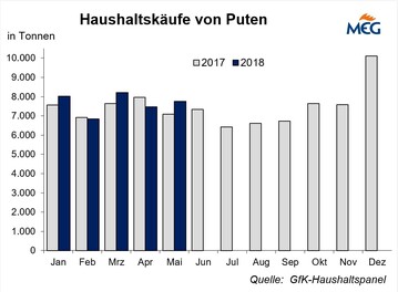 (MMB) Im Juni 2018 kauften die Haushalte Deutschlands laut GfK 7.494 t Putenfleisch, das waren 2,2 % mehr als zwölf Monate zuvor. Kumuliert über das erste halbe Jahr 2018 wurde das Vorjahresergebnis mit 3,0 % noch etwas stärker übertroffen. Insgesamt wurden 45.813 t Putenfleisch gekauft.