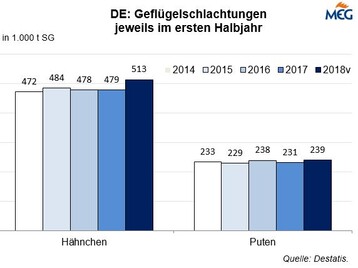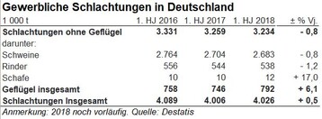 (MMB) In der vergangenen Woche haben wir eine Pressemitteilung von Destatis über die Fleischschlachtungen im ersten Halbjahr 2018 veröffentlicht. Destatis hat inzwischen die Angaben zur Geflügelfleischproduktion überprüft und korrigiert. Danach wurden im ersten Halbjahr 2018 nach wie vor 792.100 t...