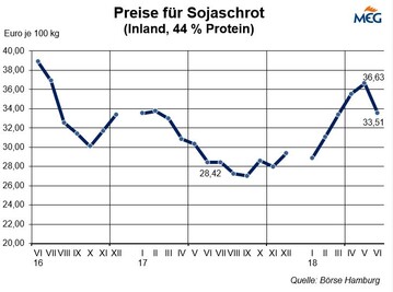 (MMB) Die Mischfutterpreise für Geflügel zogen im bisherigen Jahresverlauf leicht an. Im Juni 2018 kosteten 100 kg Masthähnchenmischfutter nach Erhebung der LWK Niedersachsen 31,85 Euro (ohne MwSt., frei Silo, Raum Weser-Ems), das waren 0,40 Euro je 100 kg mehr als zu Beginn des Jahres.