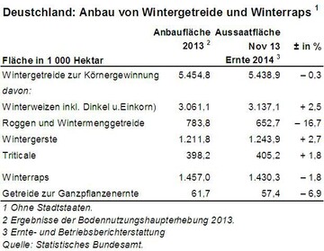 (Destatis) Für die kommende Ernte 2014 haben die Land-wirte in Deutschland auf einer Fläche von 5,44 Mio. Hektar Wintergetreide ausgesät. Nach Mitteilung des Statistischen Bundesamtes (Destatis) entspricht der Anbau von Wintergetreide für 2014 dem Niveau des Jahres 2013. Der Winterweizen bleibt...