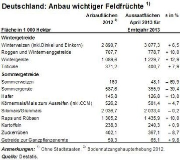 (Destatis) – Die im Herbst 2012 mit Wintergetreide bestellten Flächen sind nur in geringem Umfang von Auswinterungsschäden betroffen. Entsprechend sind die Aussaatflächen zur Ernte 2013 für Winterweizen, Wintergerste, Roggen und Triticale im Vergleich zum Vorjahr wieder gestiegen (+ 8 %), wie das...