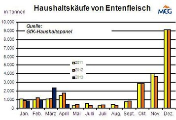 (MMB) Im April 2013 kauften die Haushalte Deutschlands etwas weniger Geflügelfleisch als im Vorjahr. Laut GfK (Gesellschaft für Konsumforschung) beliefen sich die Geflügelfleischkäufe insgesamt auf 33.471 t, das waren 2,3 % weniger als im April 2012. Ein wesentlicher Grund, dass im April dieses...