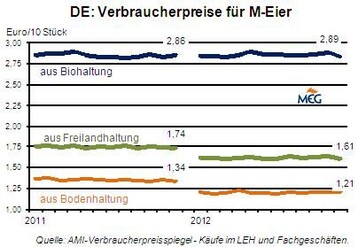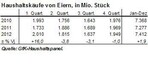 (MMB) Insgesamt erfasste das Haushaltspanel der GfK (Gesellschaft für Konsumforschung) im vierten Quartal 2012 Eierkäufe von 1.949 Mio. Eier, das waren 1,0 % weniger als im entsprechendem Zeitraum 2011. Nennenswerte Verschiebungen zwischen den Haltungsformen sind nicht mehr zu beobachten.