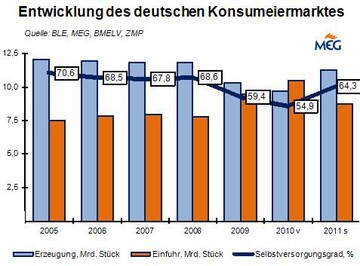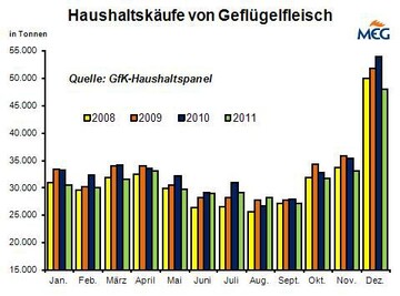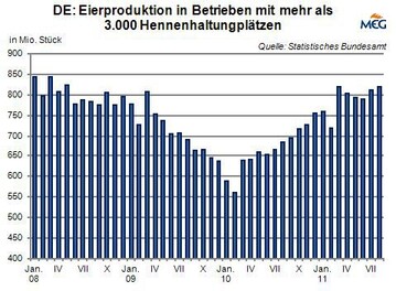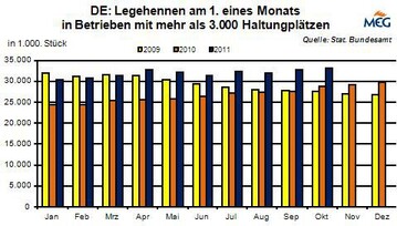 (MMB) Während in Deutschland im November 2011 mit 2,33 Mio. Legeküken um 19,6 % weniger schlüpften als zwölf Monate zuvor, wurde im Dezember mit 3,72 Mio. Küken das Vorjahresergebnis wieder um 5,0 % übertroffen. Im Jahr 2011 schlüpften laut Statistischem Bundesamt insgesamt 44,80 Mio. Legeküken...