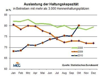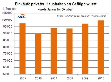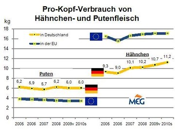 (MEG) Die Hähnchenschlachtungen beliefen sich laut Statistischem Bundesamt im vergangenen Jahr 2010 auf 802.782 t, das bedeutet gegenüber 2009 einen Zuwachs von 7 % und im Verlauf der letzten zehn Jahre nahezu eine Verdoppelung der erzeugten Menge.