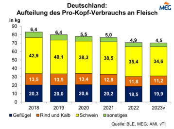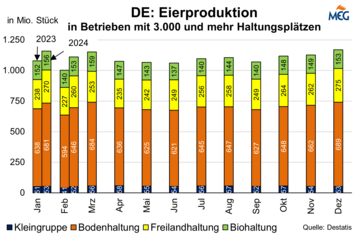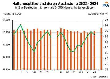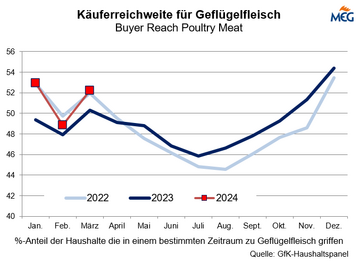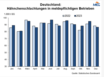 (AM) Der Trend zu steigenden Geflügelschlachtungen aus dem Jahr 2023 setzte sich im Jahr 2024 weiter fort. Im Februar 2024 wurden in Deutschland 124.138 t Geflügelfleisch erzeugt, das waren 6,3 % mehr als im gleichen Monat des Vorjahrs.
