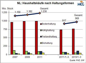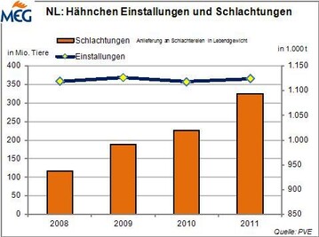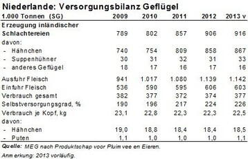 (MH/MMB) Im Jahr 2013 wurde die Geflügelfleischproduktion in den Niederlanden weiter ausgebaut. Nach den von den Productschappen Pluimvee en Eieren (PVE) veröffentlichte Zahlen beliefen sich die Schlachtungen auf 915.628 t Schlachtgewicht (SG), das waren nochmal 1,1 % mehr als 2012.