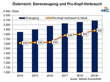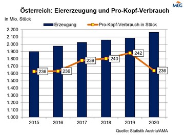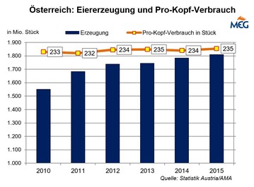 (MMB) Die Österreicher verbrauchten 2015 pro Kopf 235 Eier, das war ein Ei mehr als im Jahr zuvor. Dies belegt die kürzlich von Statistik Austria veröffentlichte Versorgungsbilanz für Eier. Der Gesamtverbrauch stieg von 2014 auf 2015 um 0,9 % auf 2,143 Mrd. Stück.
