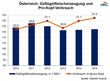 (MMB) Die Bruttoeigenerzeugung von Geflügel blieb in Österreich 2015 stabil. Wie Statistik Austria mitteilte, wurden im vergangenen Jahr 122.402 t produziert, das waren 0,5 % mehr als 2014. Stärker als die Erzeugung wuchs der Verbrauch. Der Inlandsverbrauch stieg um 1,5 % auf 183.318 t. Dies...