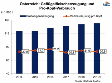 (MMB) Die Geflügelfleischproduktion in Österreich konnte in den zurückliegenden Jahren ausgebaut werden. 2019 belief sich die Bruttoeigenerzeugung laut Statistik Austria auf 134.063 t, das waren 1,4 % mehr als 2018.